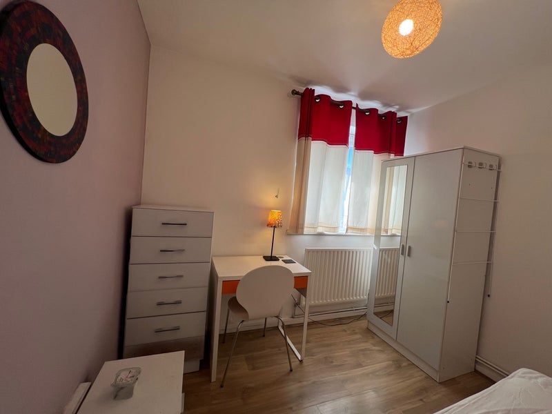 Room 3- A spacious double bedroom with a double bed with a still packed BRAND new Mattress Memory Foam - Orthopaedic Medium Firm Support, large wardrobe, studying desk, 2 night stands, and a high table.