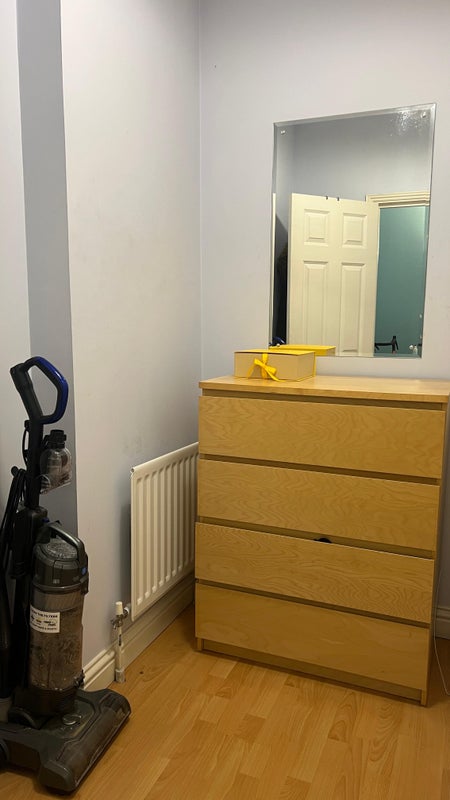 Bedroom furnished with double bed, wardrobe and drawers.