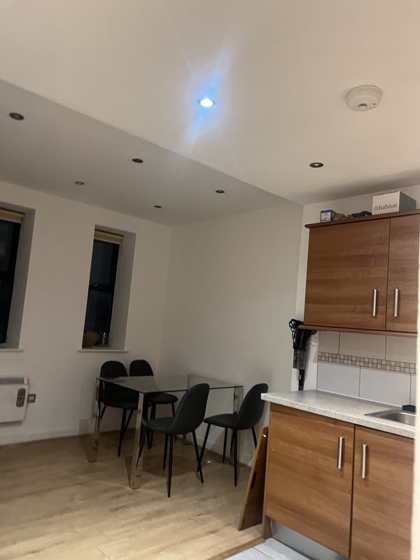 The flat includes a shared kitchen, living area, and one shared bathroom. The building benefits from a 24/7 reception, providing extra security and convenience.