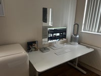 Large white IKEA desk, chair, and a stylish white retro KLARSTEIN mini fridge with freezer compartment — an optional touch of luxury, perfect for keeping drinks and cold water close at hand (main fridge available in the kitchen).