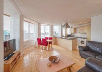 The flat is fully furnished, with a large living room and open-plan kitchen.
