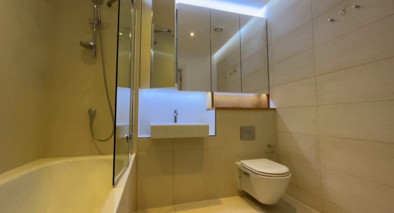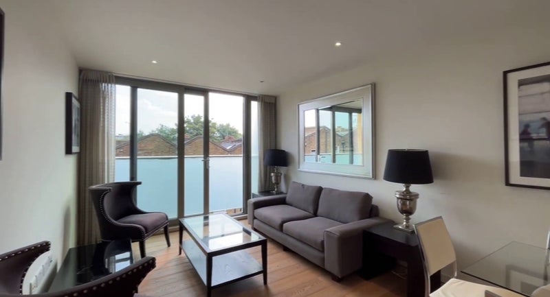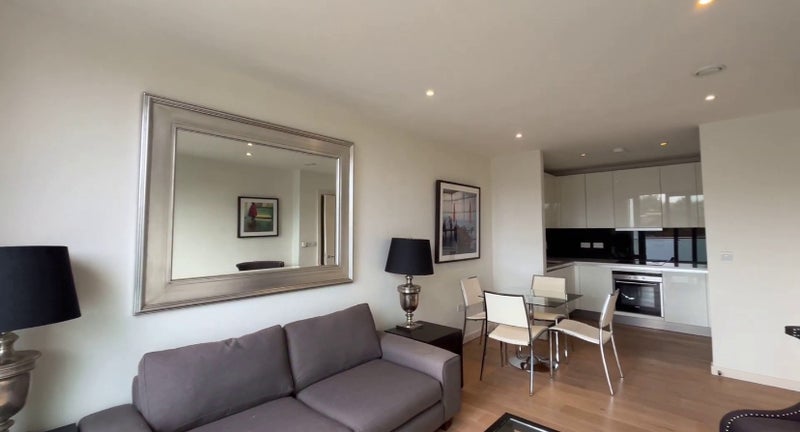 The flat has a big open plan living and dining area, a kitchen, two bedrooms and two bathrooms.