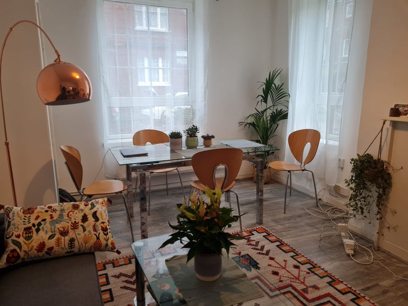 About the flat: it is a cozy ground floor, with three rooms and a shared bathroom and kitchen. As you can tell from the pictures, we have gone to quite a bit of trouble to decorate the living room and make it into a home. My friends are looking for someone that similarly values a homely shared space, which we often use and enjoy together. Rent is 933, paid upfront every 6 months (if moving in in February, it would be 6 plus February).