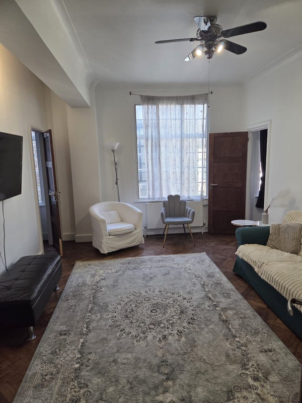 The property offers approximately 650 sq ft of accommodation and comprises a spacious reception room with high ceilings and wood flooring, two well-proportioned double bedrooms, two modern shower rooms, a separate fully fitted kitchen with integrated appliances, and a useful utility room. Large windows allow for good natural light throughout.