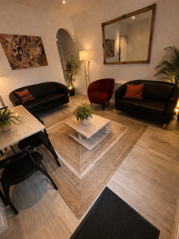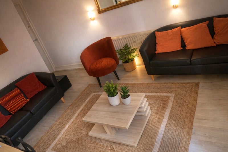 SHARED MODERN LIVING AREA WITH NEW FURNITURE, DINING TABLE TV AND NEW FLOOR