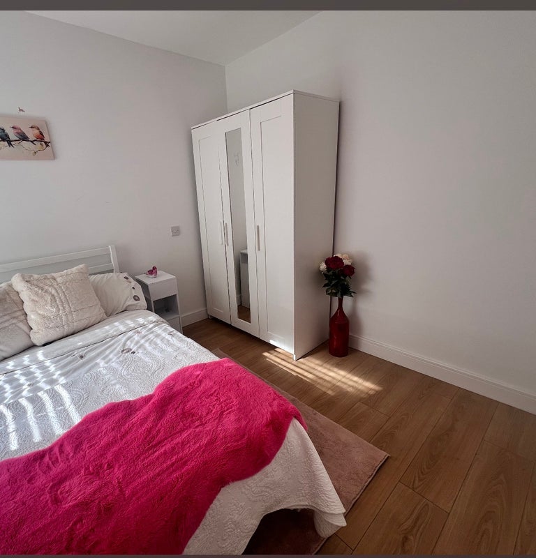 A bright, newly refurbished bedroom in a quiet and well-maintained house, ideal for a tidy professional lady looking for a peaceful home.