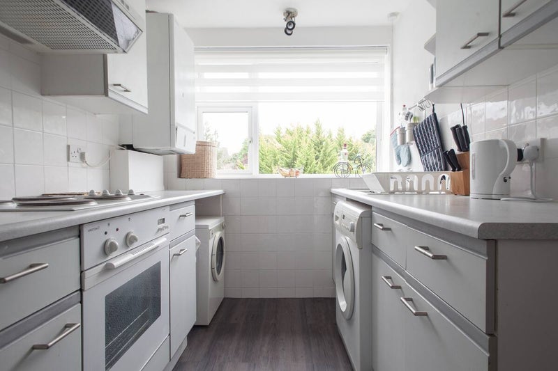 Fully equipped kitchen with fridge, microwave, washing machine, cooker/oven, and clothes dryer
