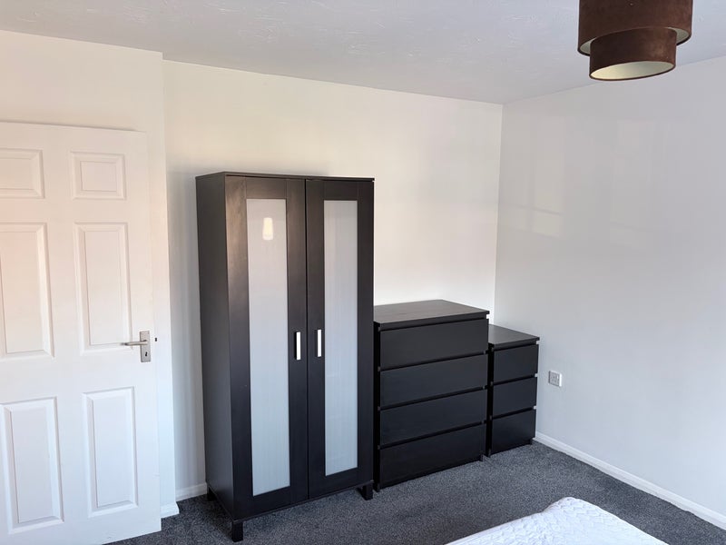 The room is fully furnished and includes a double bed, wardrobe, bedside and chest of drawers