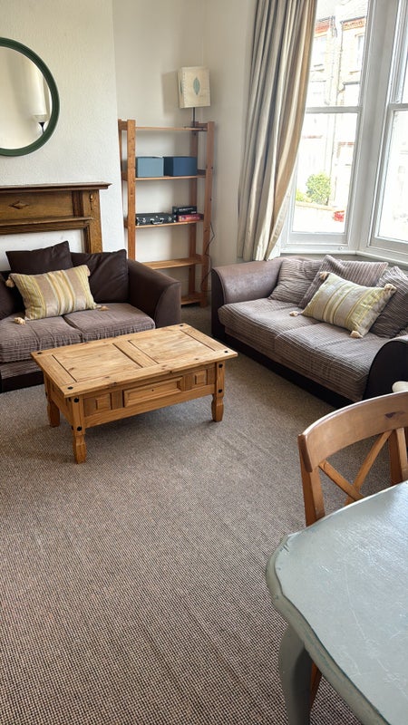 The flat is spread over two floors with high ceilings and generous living space. It features a fully equipped eat-in kitchen with washing machine, washer dryer, fridge freezer, oven and microwave. There are three double bedrooms in total, a large bathroom, an additional separate WC, and a spacious storage area on the second-floor landing.