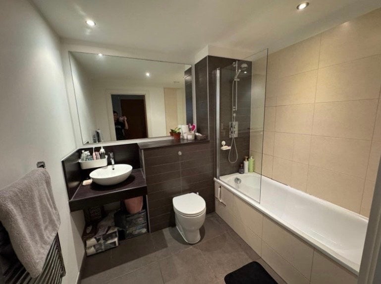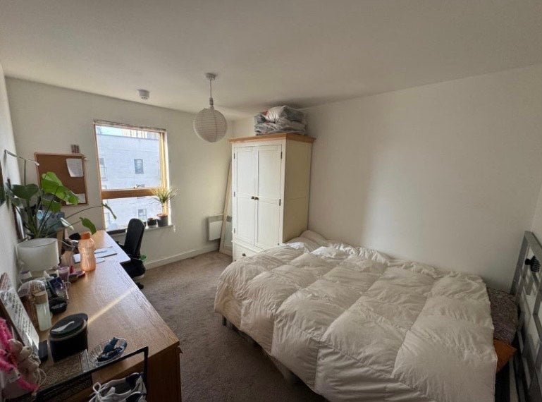 The bedroom is spacious, and comes furnished with two small drawers, a wardrobe and a bed-frame. Since the other room has an en-suite, you will have the main bathroom completely to yourself!