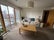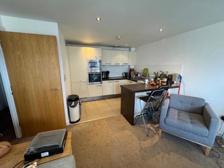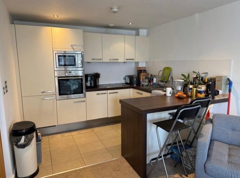 The kitchen and living room is open plan, the hob is really efficient, and there is sufficient cupboard and fridge space between you and the other occupant.