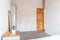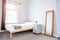 Double bedroom with wardrobe, double bed, bedside table, under bed storage and free standing full length mirror.