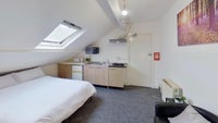 - This spacious bedsit room comes fully equipped with a double bed, wardrobe, drawers, mirror, desk, chair.