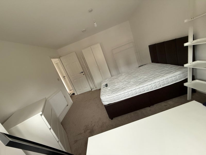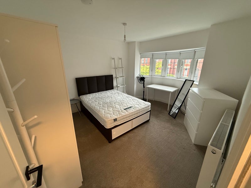 The room is spacious and bright, featuring large bay windows overlooking the front of the house. It comes fully furnished with a double bed, desk, wardrobe, and chest of drawers—ideal for both relaxing and working from home.