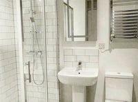 A stylish, modern shared shower room with a large shower and shower head, wash basin and toilet. Your shower room also comes with a heated, chrome towel rail.