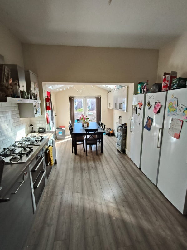 Big, light house with cosy living room & massive kitchen. Loads of fridge & cupboard space, washer & dryer, dishwasher, gas hobs and oven etc.