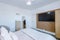 The living room is anchored by a 75-inch television with a private terrace coming directly off it.