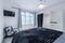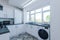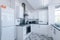 The kitchen is separate, fully equipped, and finished to match the rest of the flat: oven, hob, microwave, fridge-freezer, washing machine.