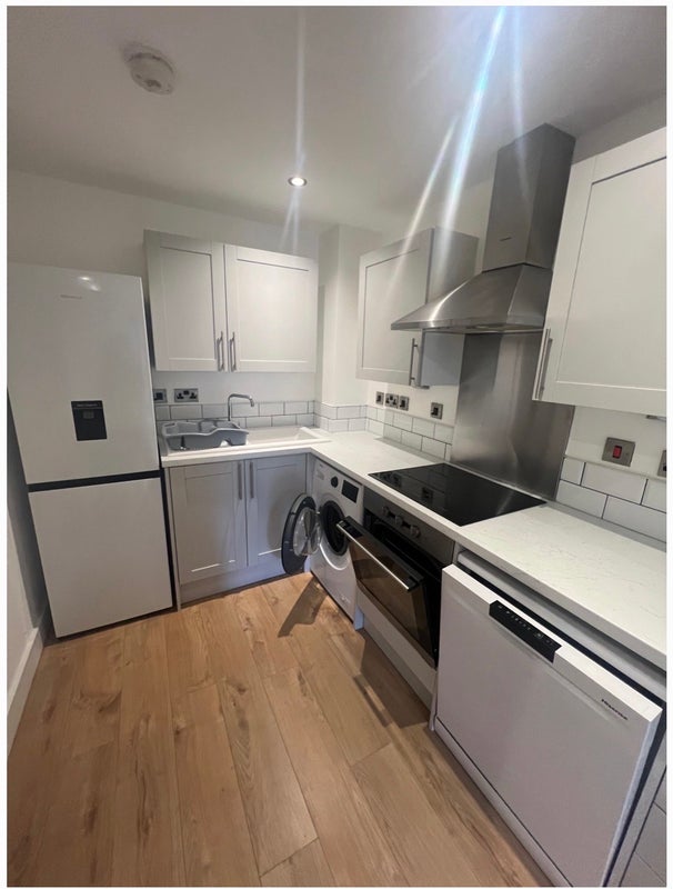 The large feature window and high ceiling combine to give the main living area a real sense of space, with wooden-style flooring seamlessly linking with the hall. The open-plan kitchen is fitted with a range of sleek contemporary base and wall units, integral electric oven and hob with extractor hood, sink with mixer tap, subway tiling splashbacks, integral dishwasher and fridge/freezer.