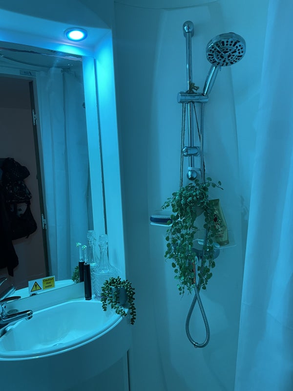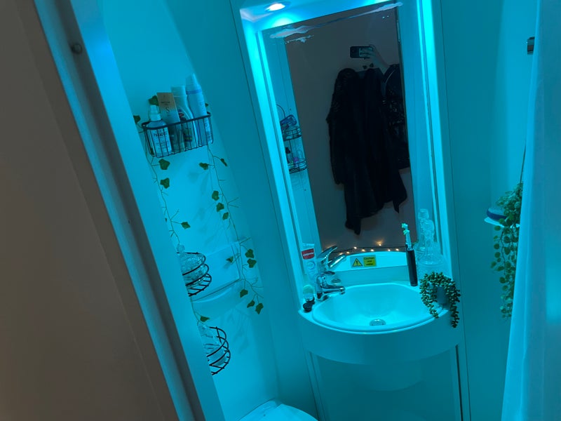 (The bathroom has normal lighting I have just put a semi permanent blue film over the lights for now)