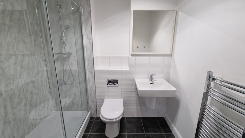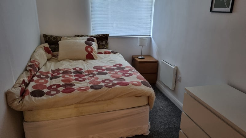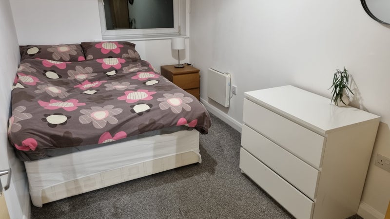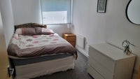 There is a double bed, desk, and a wardrobe. Big bathroom shared with 1 person only.