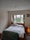 This is the master bedroom, south-facing with a double bed, armchair, wardrobe/chest of drawers, and triple window overlooking the front garden. Desk can be provided if necessary.