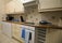 Modern communal kitchen and separate living room with all mod cons, including a large comfortable sofa.