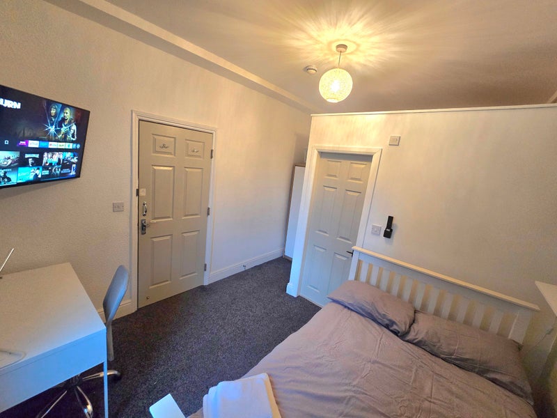 En-Suite Bedrooms with a wall mounted smart TV, thoughtfully furnished with a double bed featuring a high-quality mattress, ensuring a restful night's sleep. You'll also find a bedside table, chest of drawers, wardrobe alongside a desk with chair.