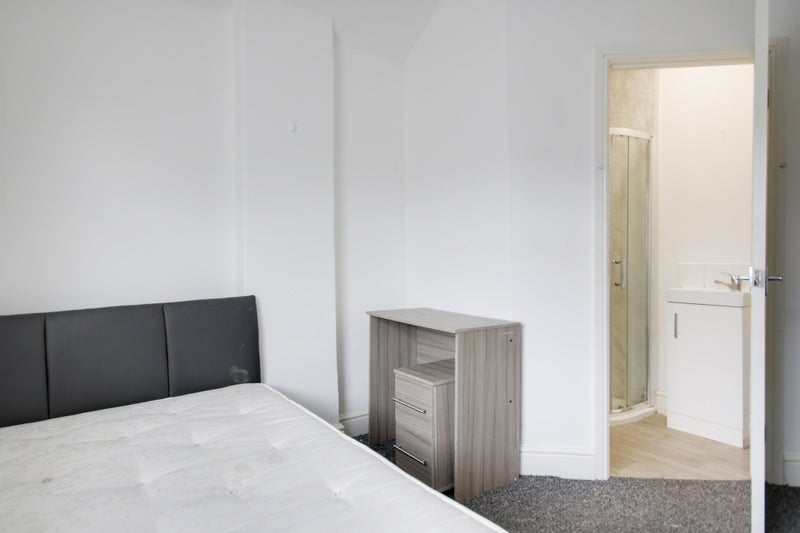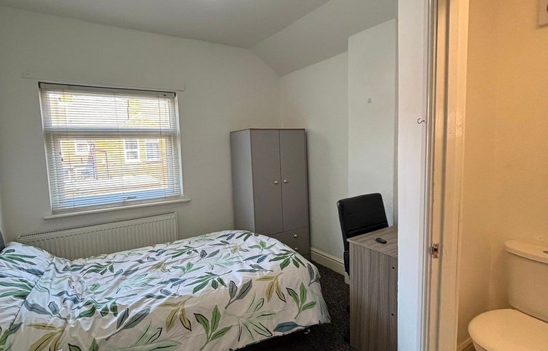 Room 2 (£430) is a medium sized student double bedroom with ensuite. The room has a double bed, wardrobe with drawers under, bedside cabinet and a study desk. Available from end of March 2026.
