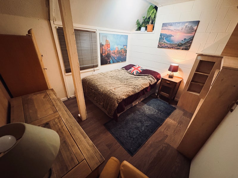 Private cosy large top floor end room with double bed and drawers, cupboard, bathrooms, 5 minutes to city center in a good friendly neighbourhood. Garden, street parking. Close to shops.