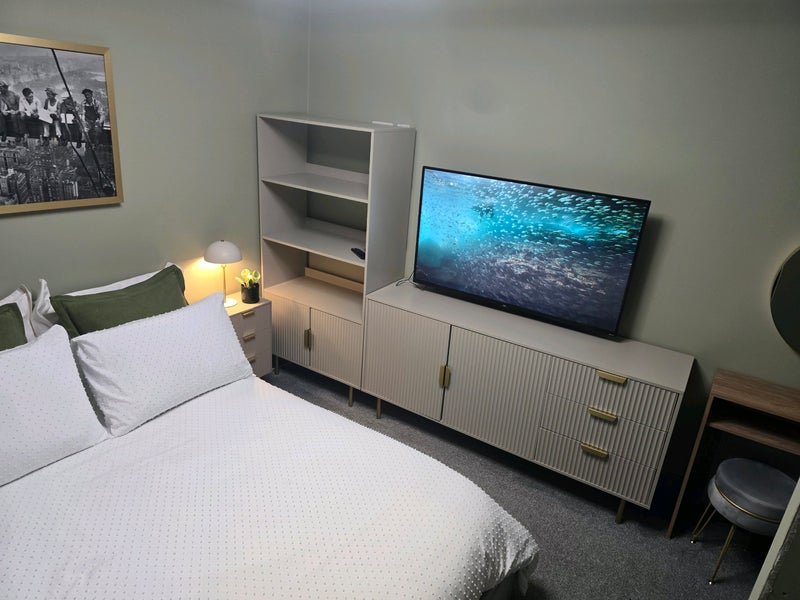 Recently decorated, fully furnished double bedroom with built in wardrobe. The room has a 55inch wall mounted television and Sky TV. Bedding and towels can also be provided.