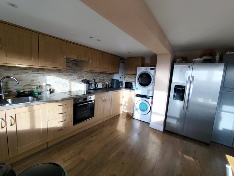 The flat is modern, bright and very comfortable. The kitchen is large, with a sofa area and lovely views towards Alexandra Palace. It’s fully equipped with an electric oven and hob, microwave, air fryer, toaster, kettle, cappuccino machine, a very large fridge, cupboard space, two washing machines and a tumble dryer.