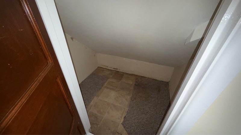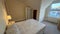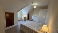 Ample storage with two attic cupboards. Furnished with a single wardrobe, and a double wardrobe chest of drawers, bedside drawers.