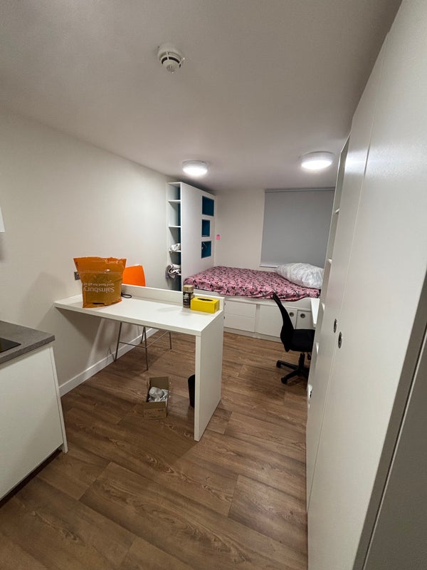 Studio bedrooms measure between 18-20sqm and come with a comfy double bed with adequate underneath storage, study area with a desk and chair, and wardrobe. You can make the most of the self-contained kitchen and en-suite bathroom with all the facilities you’ll need for student living. You’ll also have your own bar table and bar stool so you can eat in style! If you want to get the best of both worlds with your own private space but also have social aspects to enjoy in the building like our games room, then this is the room for you.