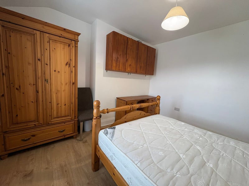 The bedroom comprises of a double bed, desk and chair, chest of drawers and a free-standing wardrobe. You have shared access to the kitchen, living area, private back yard and two main large bathrooms.