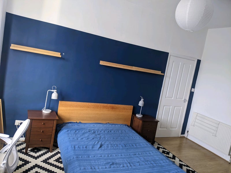 This is a large bedroom with a double bed, desk, chest of drawers and wardrobe. Furniture could be adjusted as required. Plenty of space for a desk if you work from home with room to spare. Good light from the bay windows with views towards Jesmond vale.