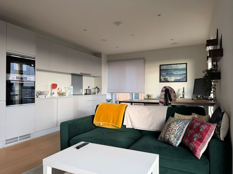 Spacious bedroom available for rent in a 2 bed flat share with its own bathroom. Fully furnished to maximise on space. The bed can be used used as single or double, depending on preference. The room also comes with a desk - ideal for work from home. Built in spacious wardrobe and chest of drawers. Shared living room )with a 65'' smart TV) and kitchen (fully stocked with appliances)