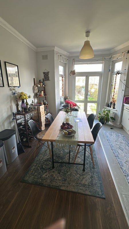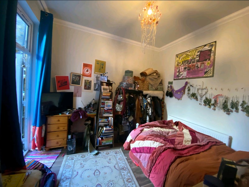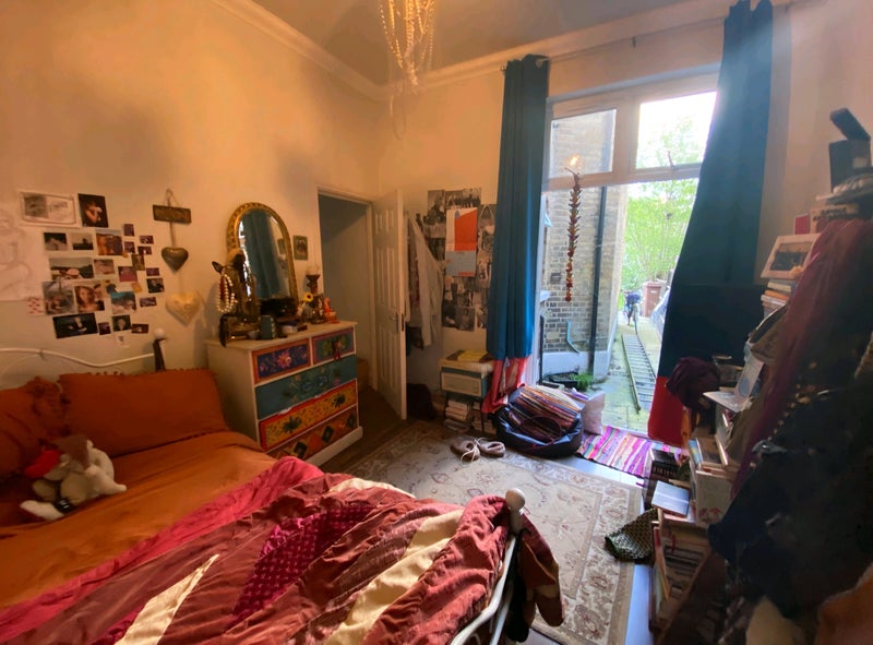 Lovely double room in a house of girlies. You’d be sharing with 4 other women aged between 26 and 34. The room has double doors which give access to the garden, but still around the corner making it private.