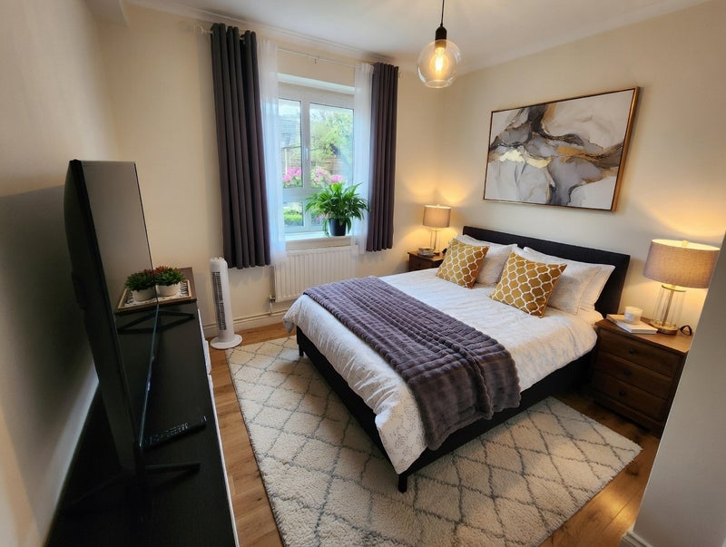 Room 3: Bright master bedroom, king size bed, drawers, desk and office chair, large TV and lots of built in storage.