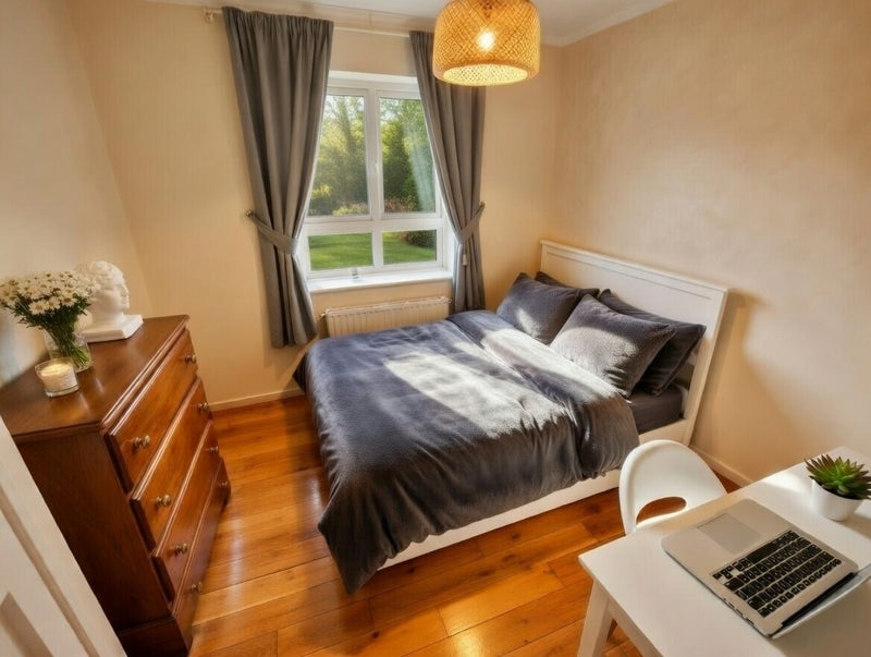 Room 2: Bright double room with kin size bed, desk, chair, drawers and built-in wardrobes.