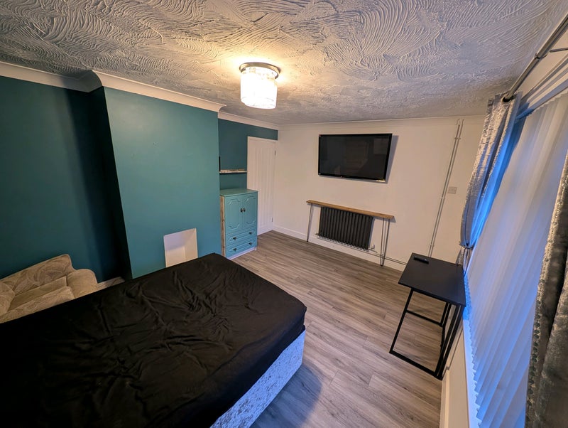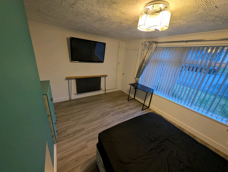 Room will have bed with drawer storage and mattress, cupboards with drawers and wardrobe space, desk and chair, included is a large (50inch?) wall mounted TV including Netflix.