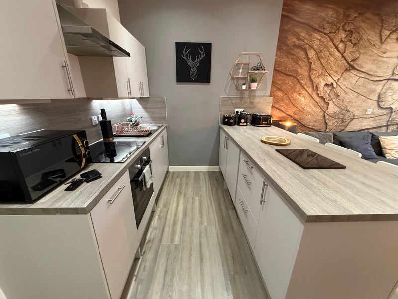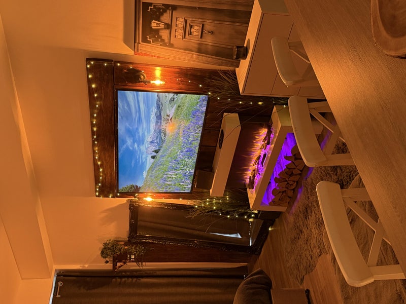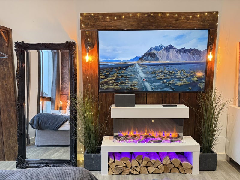 It features a king size bed, a 60 inch 4k smart TV, a washing machine/dryer, a very well stocked kitchen with a big breakfast bar, a gorgeous fireplace and lots of warm lighting.