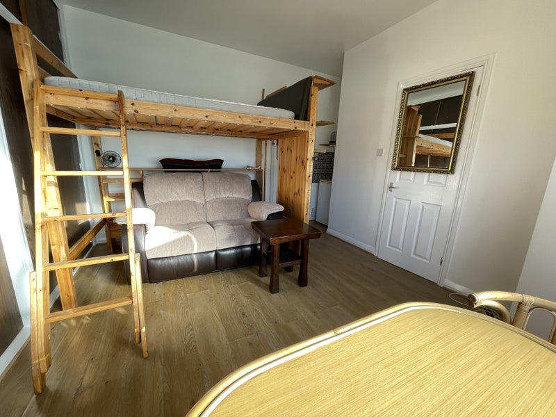Furnished double room with en-suite bathroom sky double bed, wardrobe, draws, sofa and small table.
