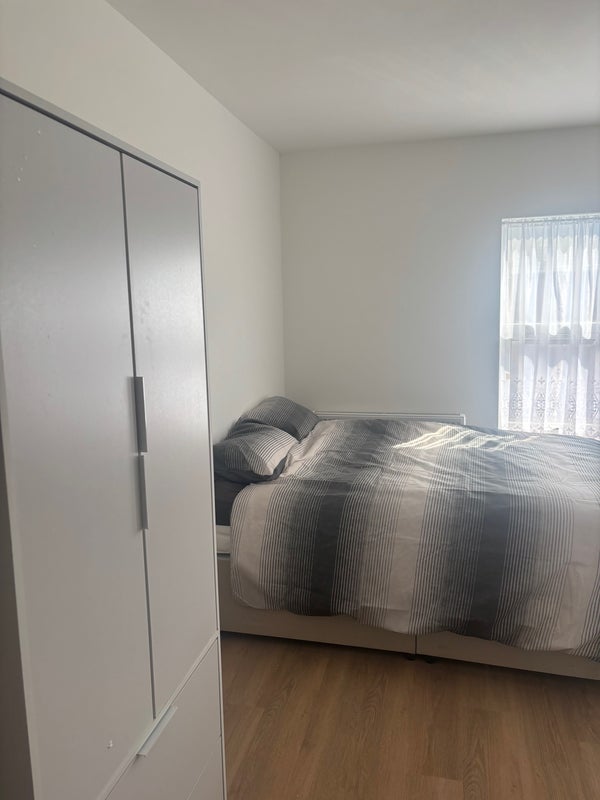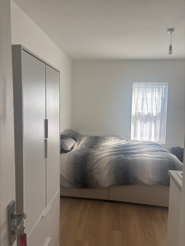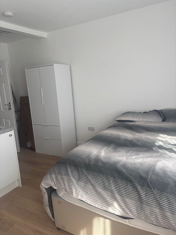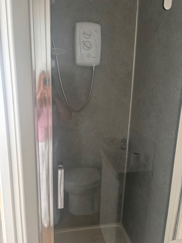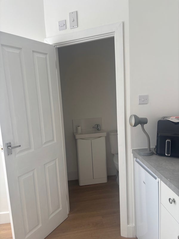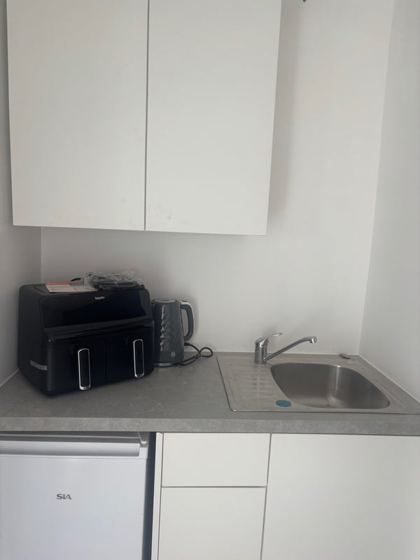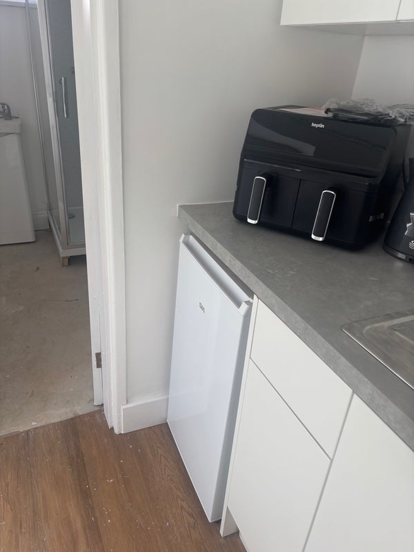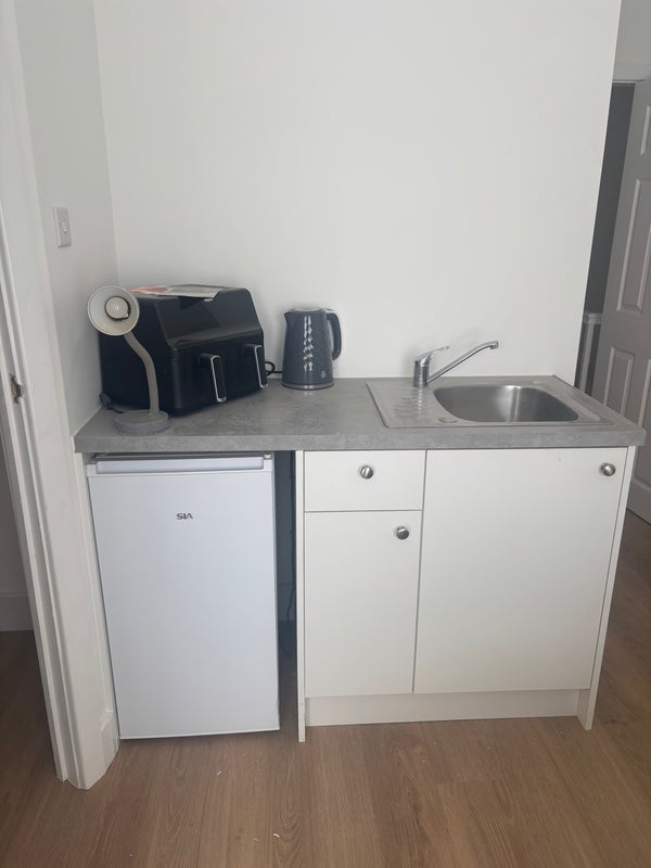 A newly refurbished double room en suite small cooking area with air fryer, fridge kettle toaster etc .