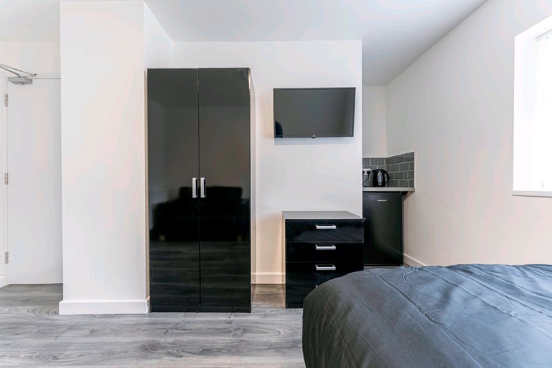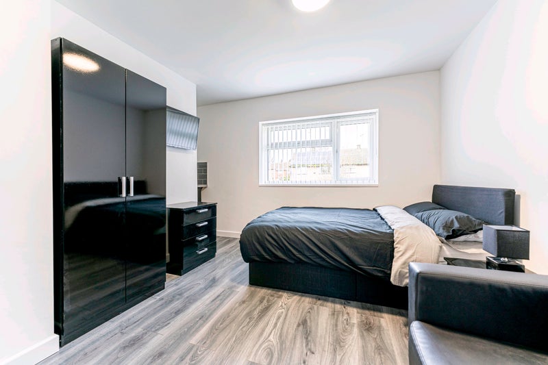 The four beautifully designed modern bedrooms are all fitted with smart TV's. Each room comes fully furnished to a high specification, comprising of; a double bed, fresh bedding, under-counter fridge with worktop space above, toaster & kettle, double wardrobe, bedside table with lamp and chest of drawers, all with an ensuite, and sofa.