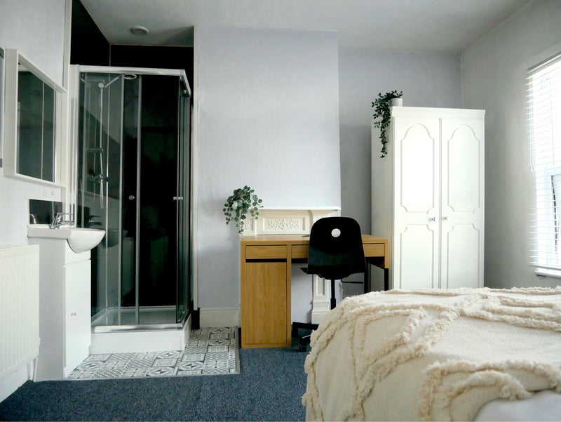 This en-suite room features a SHOWER and WASH BASIN ONLY. It does not have a toilet. In addition, the house has 2 shared bathrooms.