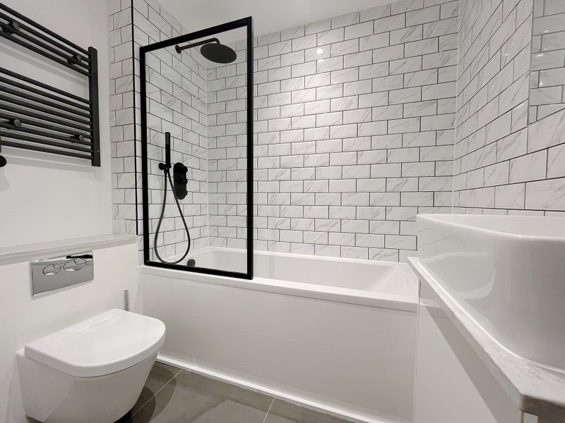 - Luxury bathroom with modern fixtures, a rainfall shower over the bathtub, matte black fittings, and stylish white subway tiling.