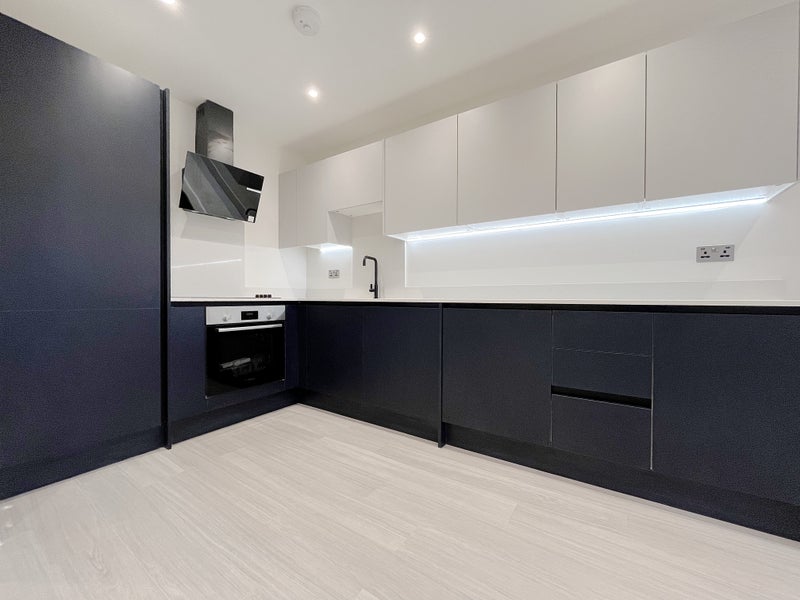 - Fully fitted modern kitchen with sleek black and white cabinetry, integrated appliances (oven, hob, extractor fan, fridge-freezer, and washing machine), and under-cabinet LED lighting.