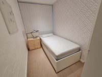 All furniture and mattress is brand new. Single bed with underbed pull out drawers, chest of drawers and good sized fitted wardrobe, central heating, double glazed window.