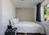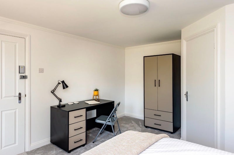 Room has double bed, bedside cabinet, draws and wardrobe.